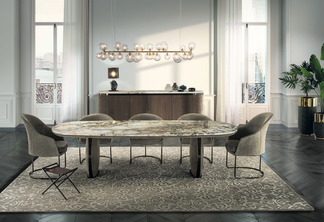 Стол Lotus — это история о природе и свободе. Мне хотелось, чтобы строгие формы показали свою «мягкую» сторону, поэтому я использовал металл и камень в сочетании с нежным тактильным текстилем. Отличительная особенность стола — внушительные ножки, декорированные кожей, и столешница — мраморная, брутальная, снизу она неожиданно оказывается теплой благодаря той же обивке.