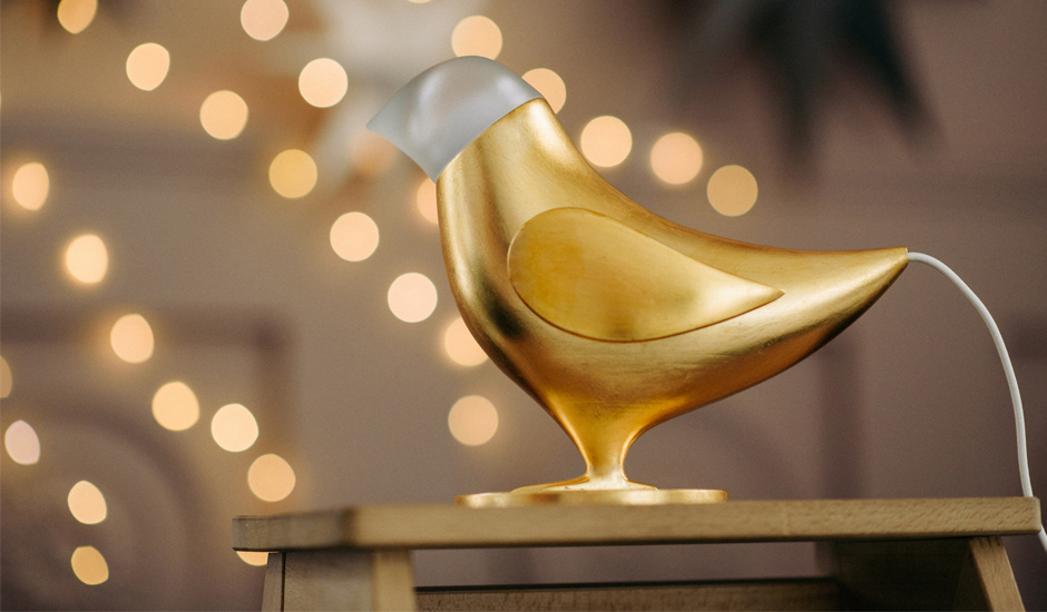 Белорусские дизайнеры Игорь Царук и Марина Ахмадова совместно со студией Fajno Design придумали для очаровательного светильника в виде птички Marina’s Birds новый цвет — роскошный золотой оттенок. Реализована новая версия может быть в двух вариантах: с использованием потали (металлический сплав) или с применением тонких пластинок сусального золота.
