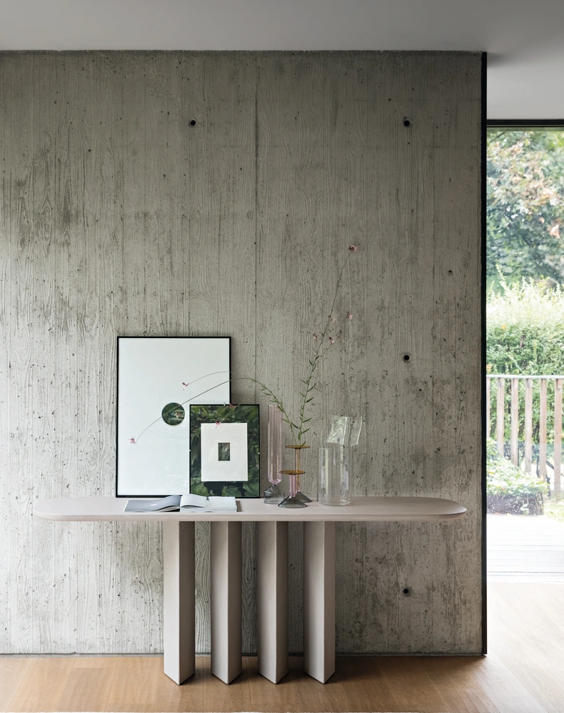 Консоль может быть дополнена керамической столешницей, которая смотрится как тонкий лист бумаги по сравнению с массивными ножками, или же не менее изящной столешницей из мрамора с закругленными краями. Также новинку можно выбрать в специальной глиняной отделке с выраженной текстурой, которая придает предмету брутальный вид. www.bonaldo.com/it/