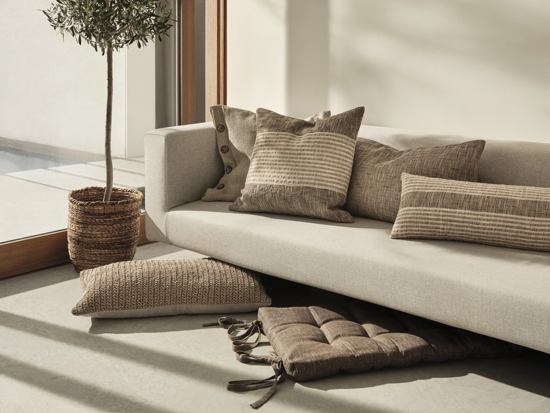 Плетеные корзины и фонари изготовлены из бананового волокна и ротанга — материалов, которые добавят уюта и тепла в ваш интерьер. Подушки прекрасно сочетаются с покрывалом, сотканным из натурального небеленого льна и окрашенного растительными компонентами.