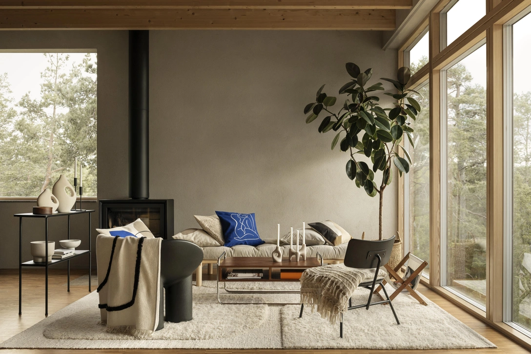 Коллекция выполнена в нейтральных оттенках, в качестве акцентных предметов выступают ярко-синие чехлы для подушек из переработанного хлопка.