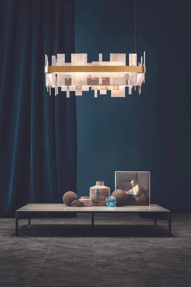 Светильник Honice, созданный для марки Masiero дизайнером Ориано Фаваретто (Oriano Favaretto) — настоящее произведение искусства. Его абажур состоит из тонких прямоугольных пластин оникса — камня, который пропускает свет, отличается живописным рисунком прожилок и красивым золотистым оттенком. Пластины крепятся к латунному ободу — в результате получается эффектная конструкция, напоминающая, по словам самого дизайнера «корону или корабль, плывущий в воздухе».