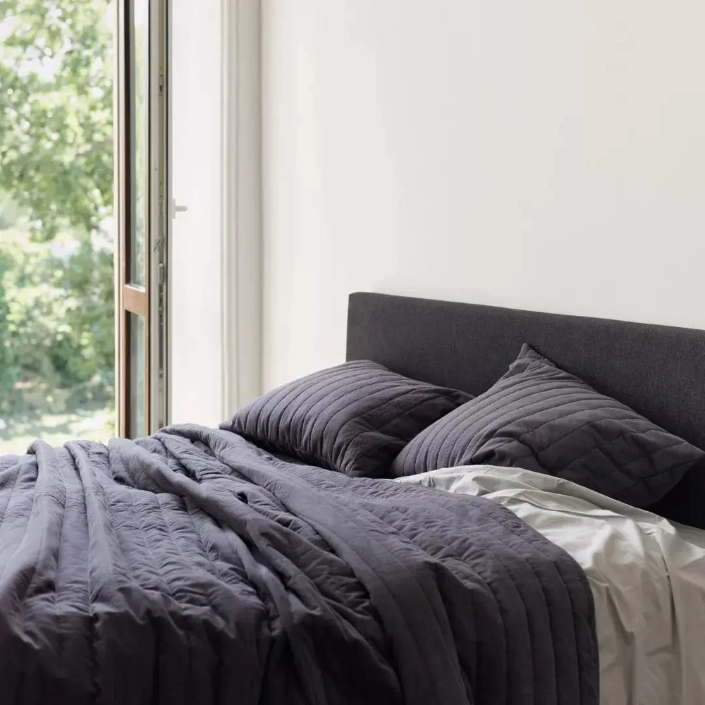 В коллекцию вошли двусторонние покрывала и односторонние чехлы на подушку из мягкого вареного хлопка, представленные в двух оттенках: универсальный бежевый и строгий, лаконичный графит. Цветовое решение коллекции MRФS x Delo дает возможность по-разному заправлять кровать, а монохромный, минималистский дизайн изделий отлично впишется практически в любой интерьер. Приобрести их можно в онлай-магазине бренда.