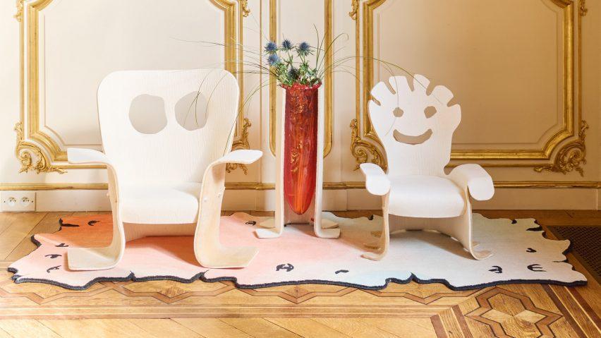 Из ткани выполнены как сами сиденья, так и ножки, переходящие в подлокотники. Каждый стул имеет изогнутую спинку, украшенную вырезанным лицом, что придает предметам игривость, характерную для работ Пеше.