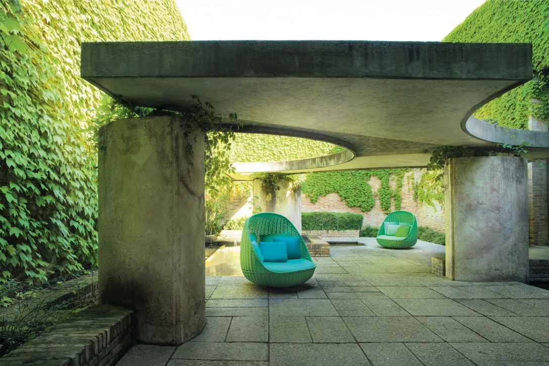 Еще одна новинка — коллекция Oasi, работа обладателя премии Red Dot Франческо Рота. Модули собираются в отдельно стоящие кресла, пуфы, угловые или прямые диваны. Основания и спинки сделаны из новейшего материала Diade — термоформованного пластика, имитирующего плетеный материал. Оригинальный, легкий, быстро сохнущий, защищенный от проникновения пыли и УФ-лучей, он стал основой и другой коллекции дизайнера для бренда — стульев, столов и шезлонгов Lido.