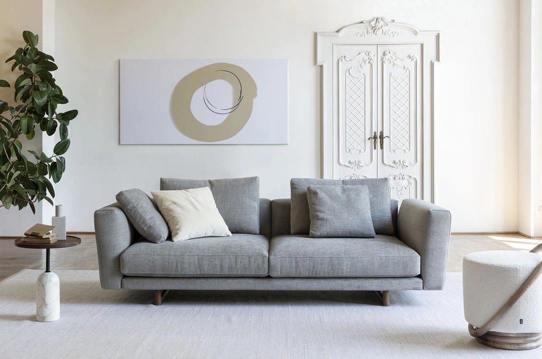 Подчеркнуто классический диван Softbay, разработанный дизайнером Джузеппе Вигано (Giuseppe Viganò), выглядит неожиданно современно рядом с пуфом Smile по дизайну Marconato & Zappa. Его отличительная особенность — деревянная ручка, которая также может служить удобной спинкой.