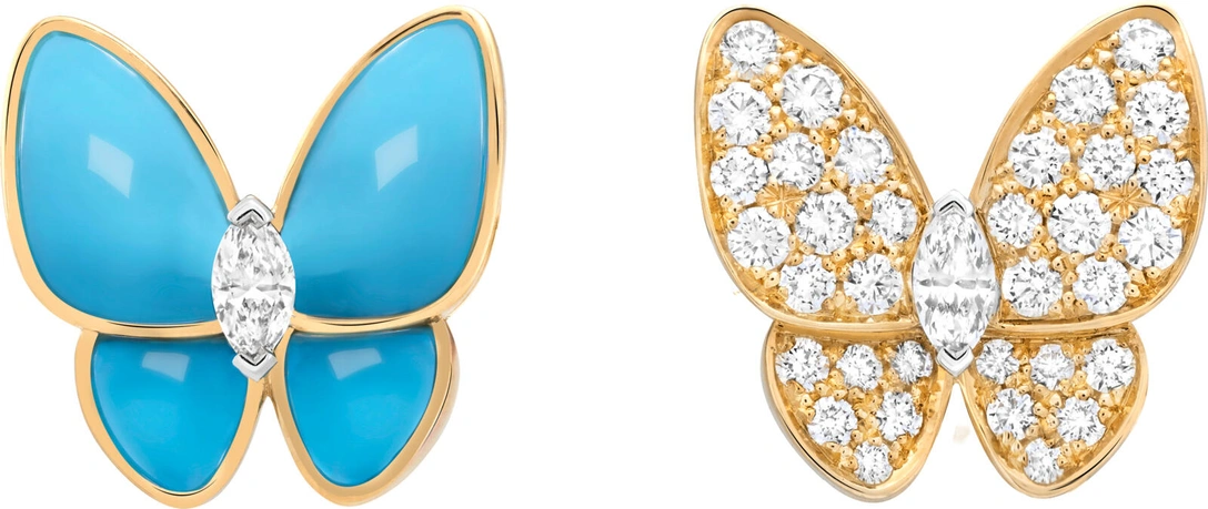 Камни для коллекции Two Butterfly тщательно отбирались ювелирами Дома, исходя из требований гармоничности и однородности небесно-голубого оттенка. Четыре камня образуют крылышки бабочки, их обрамляет «оправа» из желтого золото, сияние которой усиливается блеском бриллиантов. Бриллианты для изделий также проходят тщательный отбор: используются только камни цвета от D до F и чистоты от IF до VVS2. www.vancleefarpels.com