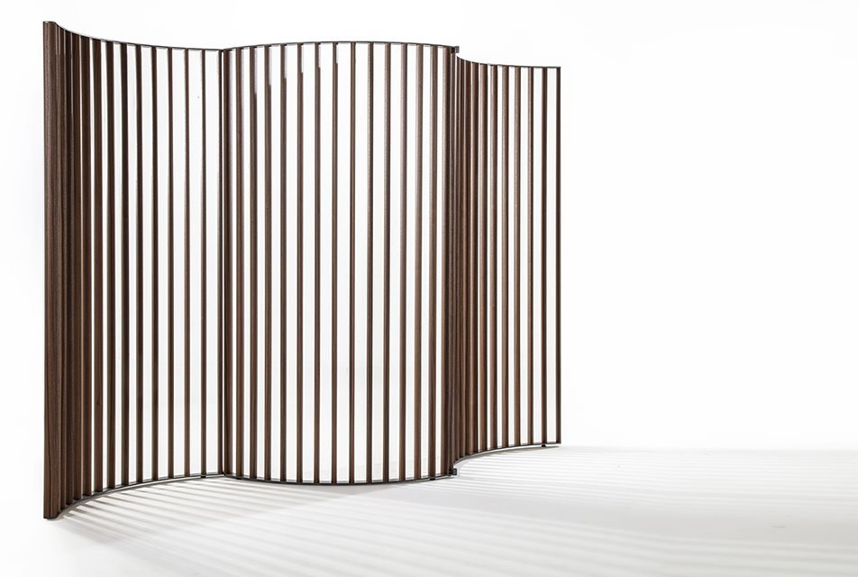 Ширма Gamen из алюминия и ореха каналетто от Porada выполнит сразу две функции — станет изящным арт-объектом в интерьере и поможет зонировать пространство