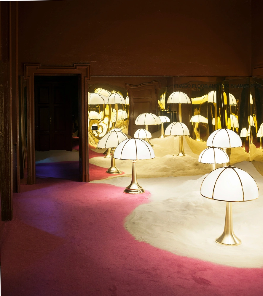 Стены галереи Dimore Studio вновь перекрасили — на этот раз в оттенок спелой вишни. Точеные основания предметов живописно утопают в песке. Зрелищности инсталляции добавляют светоотражающие панели из латуни и ковры оттенка фуксии. Заключительным штрихом стал саундтрек, создающий особое медитативное настроение.