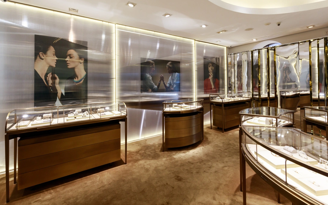 На лестнице царит волшебная атмосфера белых ночей, переданная с помощью зеркальной подвесной инсталляции. И, наконец, на втором этаже бутика вы попадаете в царство ночи и тьмы. Все внимание здесь направлено на загадочную коллекцию Panthere, представленную в необычной геометричной интерпретации.