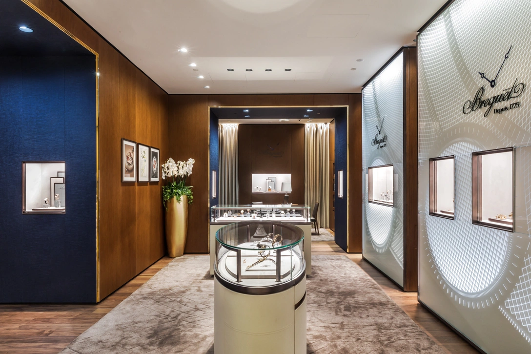 В августе в ГУМе открылся обновленный бутик часового Дома Breguet — крупнейший не только в России, но и в Европе. Магазин площадью 317 кв м расположился на первой линии универмага, два этажа соединены мраморной лестницей и составляют цельное органичное пространство, в оформлении которого использованы ценные породы дерева и полупрозрачное матовое стекло с гильошированными узорами, уже ставшее визитной карточкой Breguet
