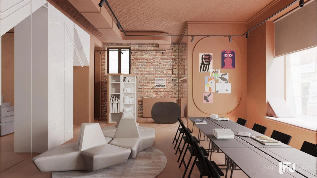 Пространство культурного центра выполнено в теплой гамме цвета молочного шоколада, что делает его уютным, независимо от времени года и времени суток. При желании его можно зонировать с помощью мягких перегородок и создать более камерные зоны для работы и общения.