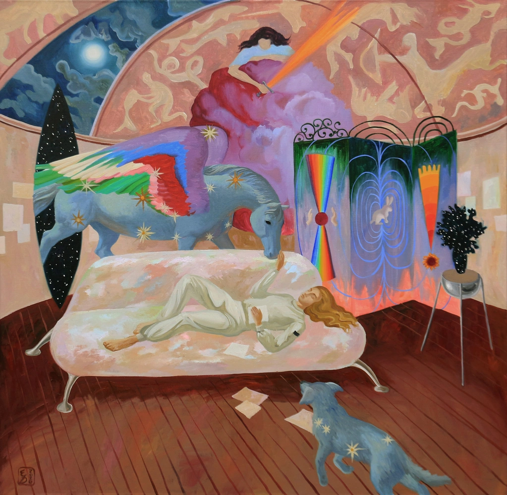 Красочные работы художницы, приоткрывают дверь в мир своих фантазий, где живут сказочные герои и происходят волшебные события. Гербы словно принадлежат магическим кланам фей и драконов, а рисунок на окне будто появился по мановению волшебного жезла. Однако выставка не оставляет ощущения прочитанной сказки, а скорее путешествия в параллельную реальность. «Космос той вселенной, которую я рисую не связан с ракетами и технологиями, это космос, по которому путешествует наше бессознательное. И портал в эти космические путешествия находится внутри нас», — добавляет Евгения.